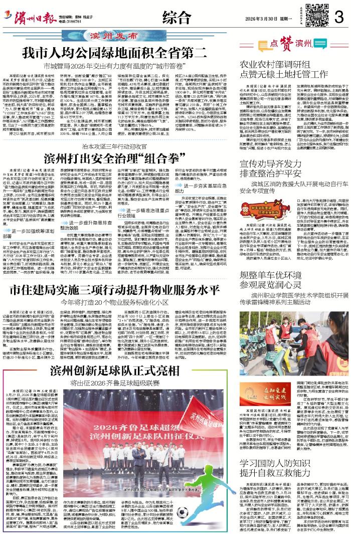 全力以赴提品质,城市变得更富颜值。深入推进“绿满城市·花漾滨州”工程,全市累计建成各类公园339处、绿道759.4公里,人均公园绿地面积位居全省第二位。深化“节日扮靓”行动,精心打造14条景观道路、43处节点景观,通过栽植时令花卉、增设景观小品,让城市颜值持续在线。升级主城区照明品质,深度融合地域文化、城市精神与艺术创意,营造出独具滨州特色的春节城市夜景氛围。实施养护品质提升工程,精细修剪乔灌木8.5万株、绿篱80万平方米,治理裸露土地11.3万平方米;构建空地协同立体化防治体系,精准治理杨柳“飞絮”,飞絮总量同比下降85%。