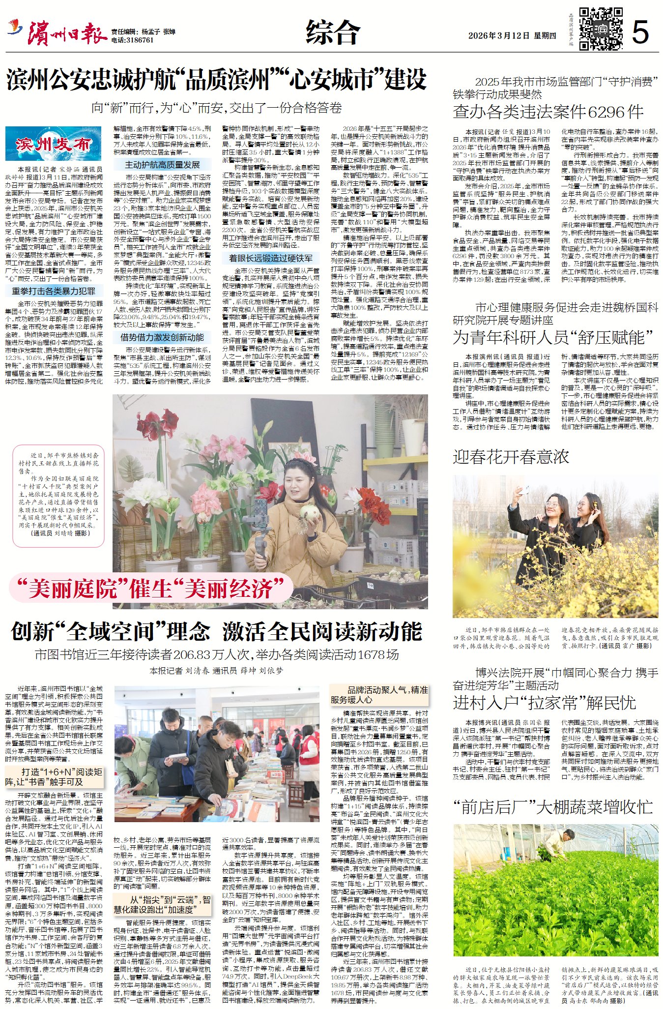 精准施治保平安。以上级部署的“齐鲁守护”统筹打防管控,坚决做到命案必破、总量压降,系列安保圆满顺利,黑恶线索查打率100%,刑事案件破案率再提升5个百分点,电诈发案、损失双下降。深化社会治安协同共治,矛盾纠纷类警情100%规范处置。强化道路交通综合治理,重大隐患100%整改,严防较大及以上事故。