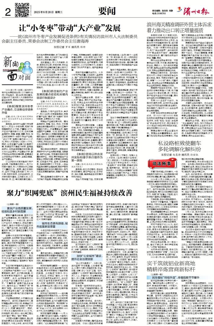 滨州日报/滨州网讯 2025年9月1日起,《滨州市冬枣产业发展促进条例》(以下简称《条例》)开始施行。就《条例》有关情况,记者采访了滨州市人大法制委员会副主任委员、常委会法制工作委员会主任唐海涛。