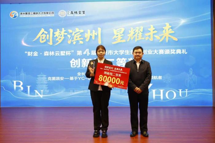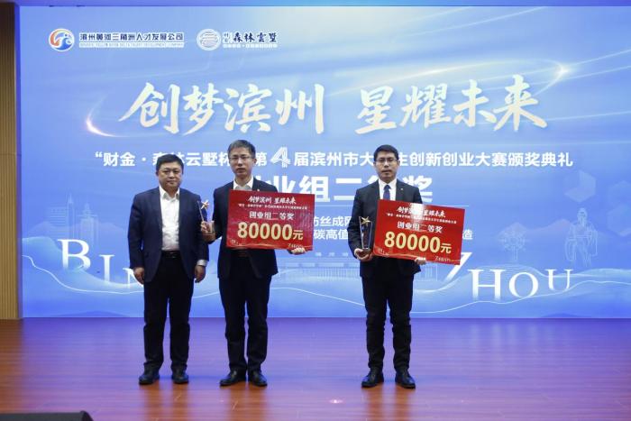 滨州市融资担保集团党委副书记、副董事长、总经理赵鹏为创业组“二等奖”获得者颁奖