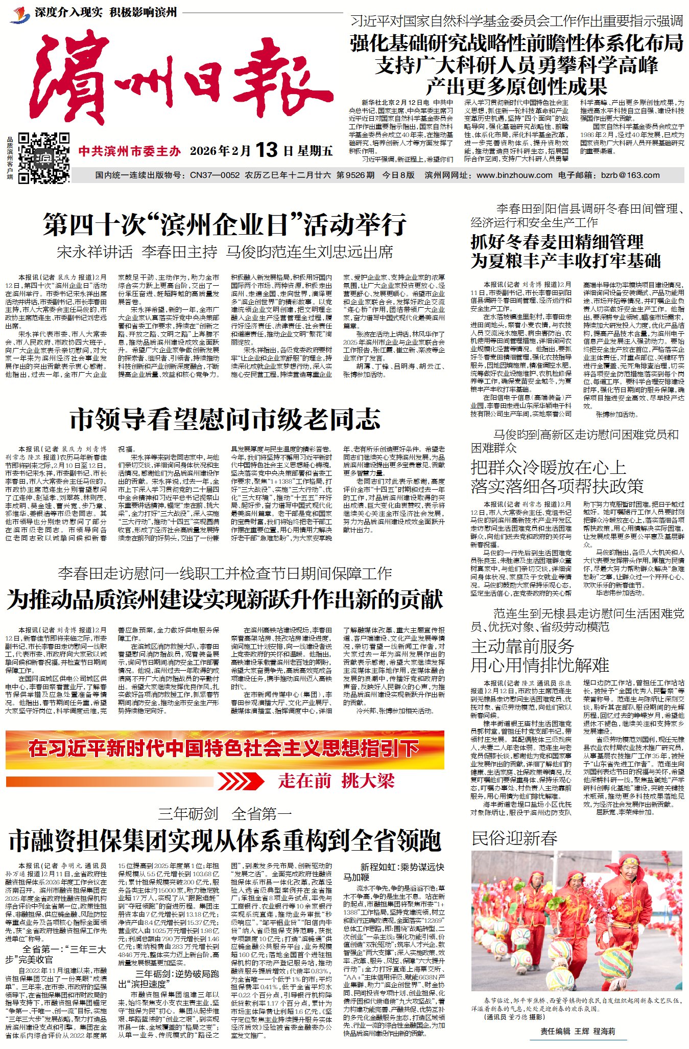 宋永祥希望,新的一年,全市广大企业家认真落实好党中央决策部署和省委工作要求,持续在“创新之路、开放之路、文明之路”上奔腾不息,推动品质滨州建设成效全面跃升。希望广大企业家争做创新发展的探索者、组织者、引领者,持续推动科技创新和产业创新深度融合,不断提高企业质量、效益和核心竞争力。积极融入新发展格局,积极用好国内国际两个市场、两种资源,积极走出滨州、走遍全国、走向世界,演绎更多“滨企创世界”的精彩故事。以党建统领企业文明创建,把文明理念融入企业生产经营管理全过程,履行好经济责任、法律责任、社会责任和道德责任,推动企业文明“繁花”绚丽绽放。