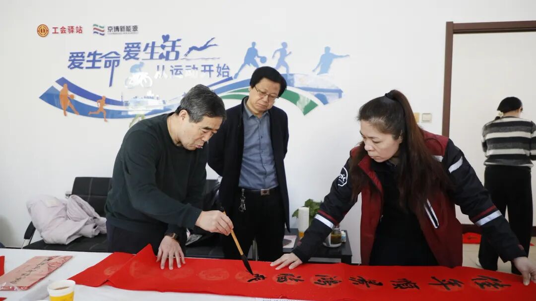 活动现场,来自省、市书法美术家协会的名家以笔为媒、以字传情,用最传统的方式,为产业工人、新就业形态劳动者、农民工等书春送福。滨州市职工文体协会美术专业委员会主席张家会表示:“非常高兴能为文化建设献一份微薄之力、为职工群众送一份真挚祝福”。