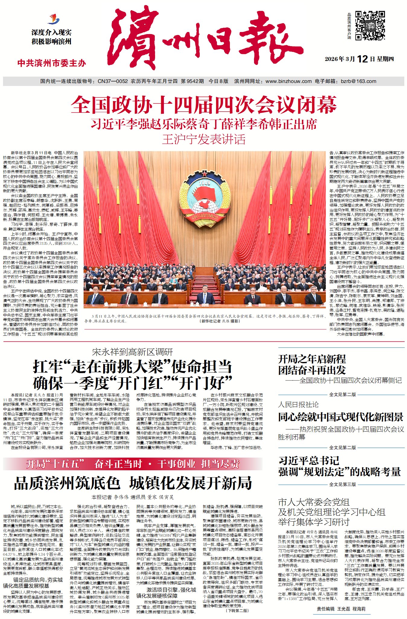 滨州日报/滨州网讯 3月11日,市委书记宋永祥到高新区调研时强调,要深入贯彻党的二十届四中全会精神,认真落实习近平总书记视察山东重要讲话和重要指示批示精神,坚定扛牢“走在前、挑大梁”使命担当,实干开局、实干作为、实干争先,打好“三大战役”、实施“三大行动”、优化“三大环境”,确保一季度“开门红”“开门好”,奋力推动品质滨州建设成效实现新跃升。