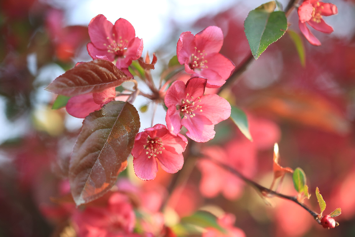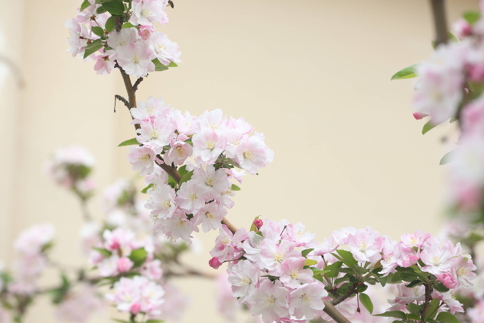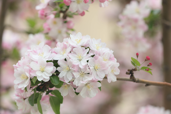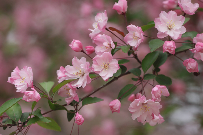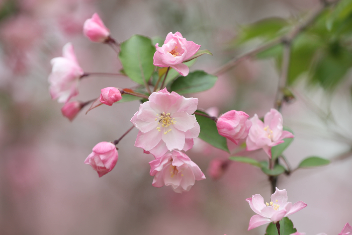 记者在市城管局获悉,海棠素有“花中神仙”的美称,承载着富贵、祥和等美好寓意。海棠多为蔷薇科苹果属或木瓜属落叶小乔木,种类繁多,最具代表性的是海棠四品,即西府海棠、垂丝海棠、贴梗海棠、木瓜海棠,此外还有北美海棠。其中,西府海棠花姿挺拔,花瓣莹润,淡粉缀枝,自带清雅风骨;垂丝海棠花梗细长下垂,花苞如胭脂初染,盛放时粉白交织,娇柔欲滴;贴梗海棠花色浓烈,贴枝而生,刚中藏秀;木瓜海棠多为重瓣,花梗短粗或近无梗,端庄沉稳。