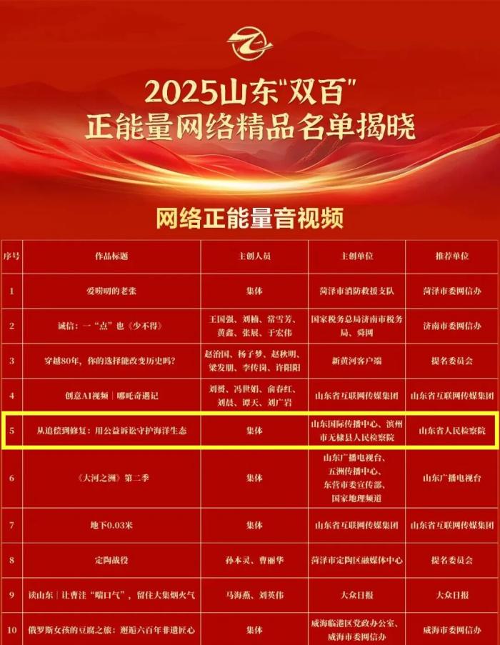 2月3日,由山东省委网信办主办的2025山东“双百”正能量网络精品征集展播活动揭晓结果,经过评委线上打分和线下评审以及结果公示,200件网络精品脱颖而出,无棣县检察院创作的新媒体作品《从追偿到修复:用公益诉讼守护海洋生态》成功入选2025山东“双百”正能量网络精品。