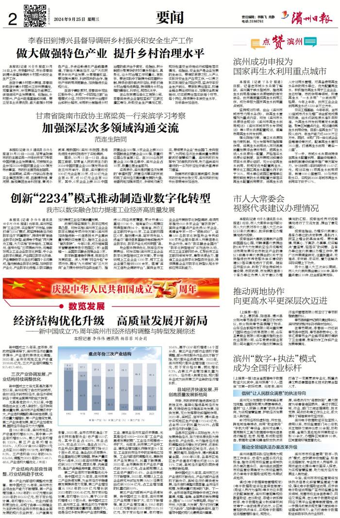 新中国成立75年来,滨州市三次产业结构不断优化,产业内部行业结构不断升级,县域经济协调快速发展,经济结构调整效果显著,全市经济规模、发展质量均有质的飞跃。下一步,全市将继续坚持稳中求进工作总基调,完整、准确、全面贯彻新发展理念,围绕“1+1188”发展格局,突出“大开放、大改革、大发展”,聚力打好打赢“三大战役”,加快建设品质滨州,奋力谱写中国式现代化最美滨州篇章。