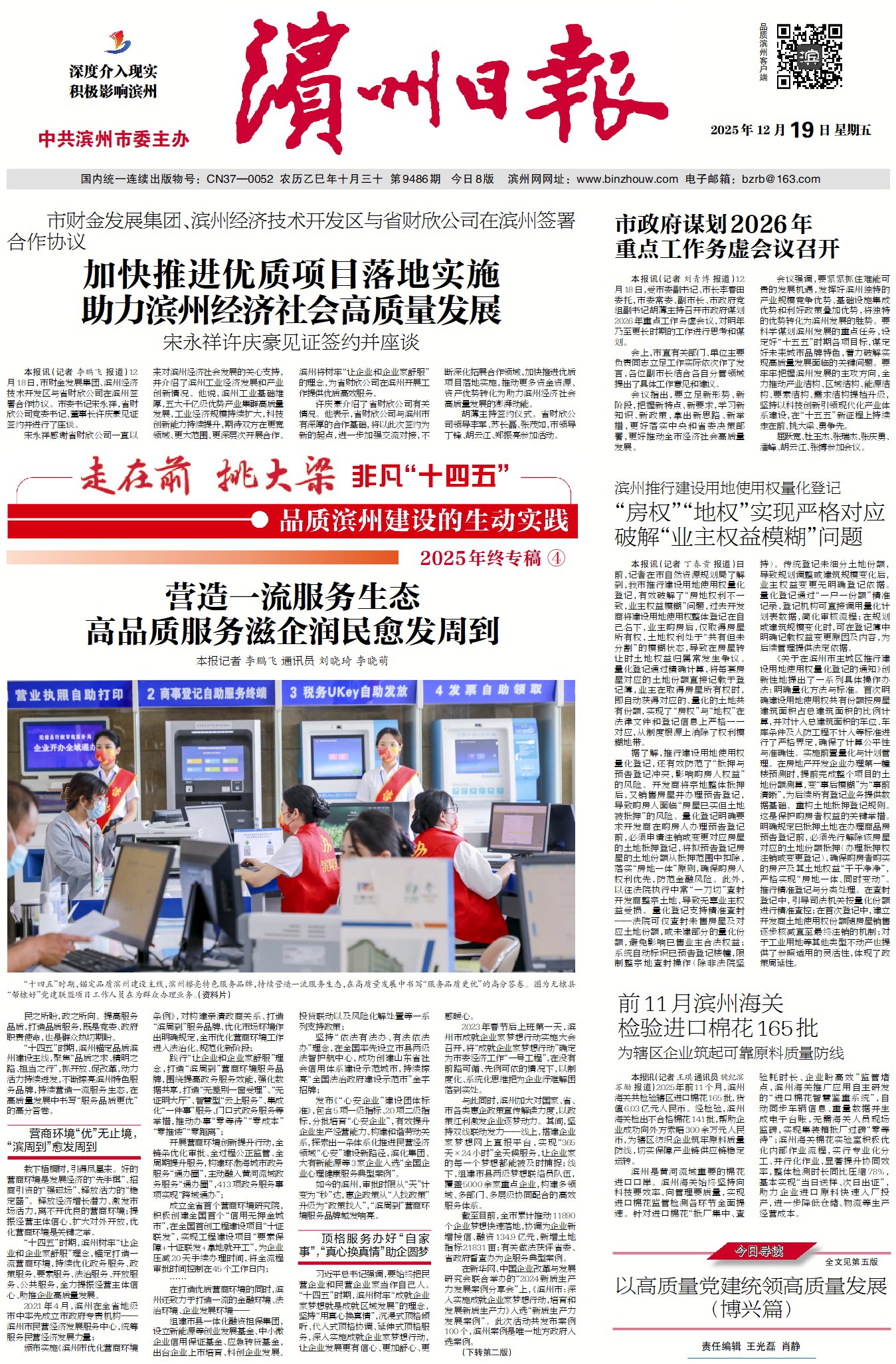 习近平总书记强调,“我们靠实干创造了辉煌的过去,还要靠实干开创更加美好的未来”。优化服务品质,是一项没有休止符的系统性工程。站在即将迈入“十五五”时期的新起点上,滨州将抓好政务服务、政策服务、市场服务、要素服务、法治服务“五大服务”,持续擦亮“滨周到”营商环境服务品牌,推动服务品质实现新跃升,滋养企业“枝繁叶茂”、润泽民生“百花盛开”。