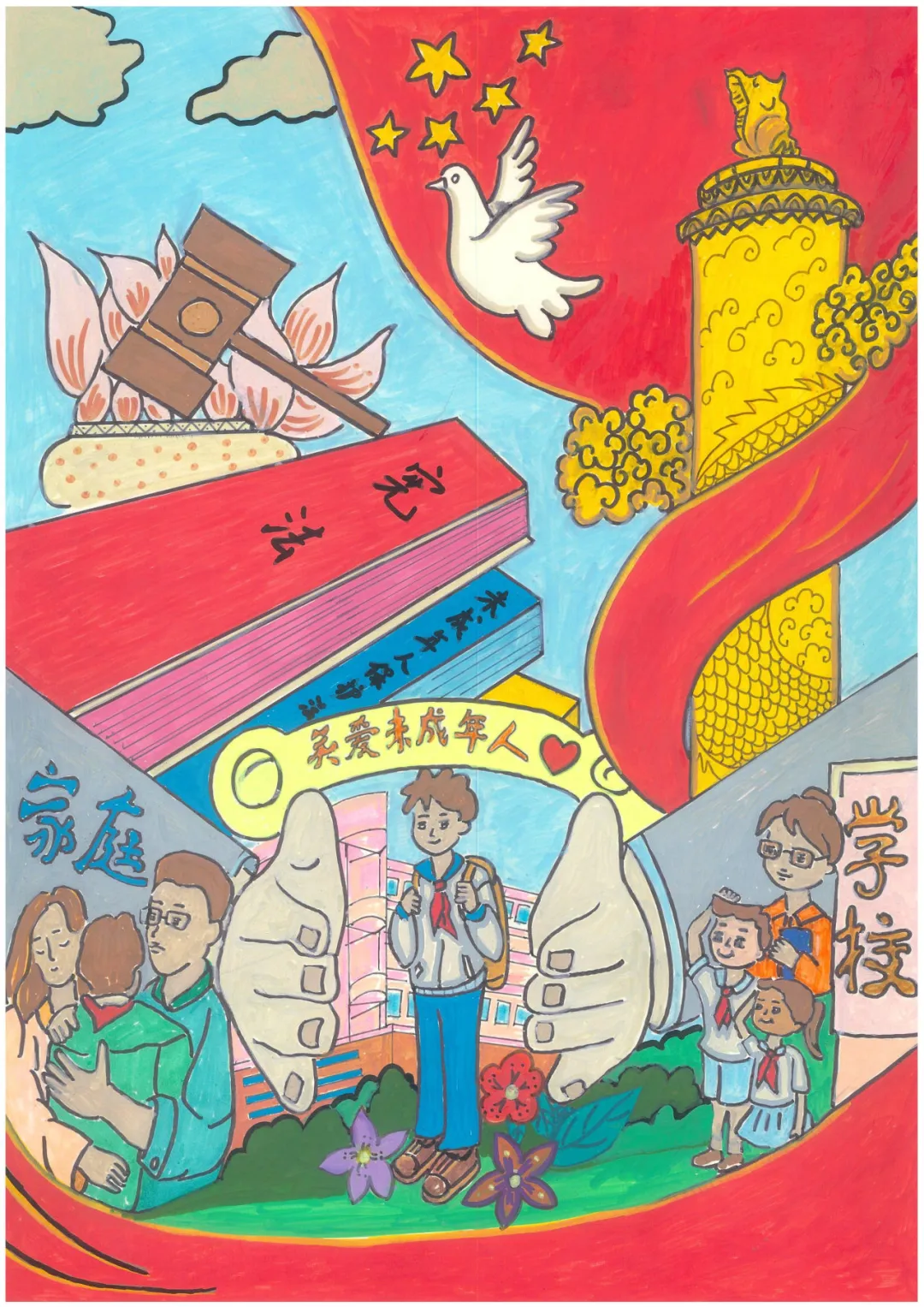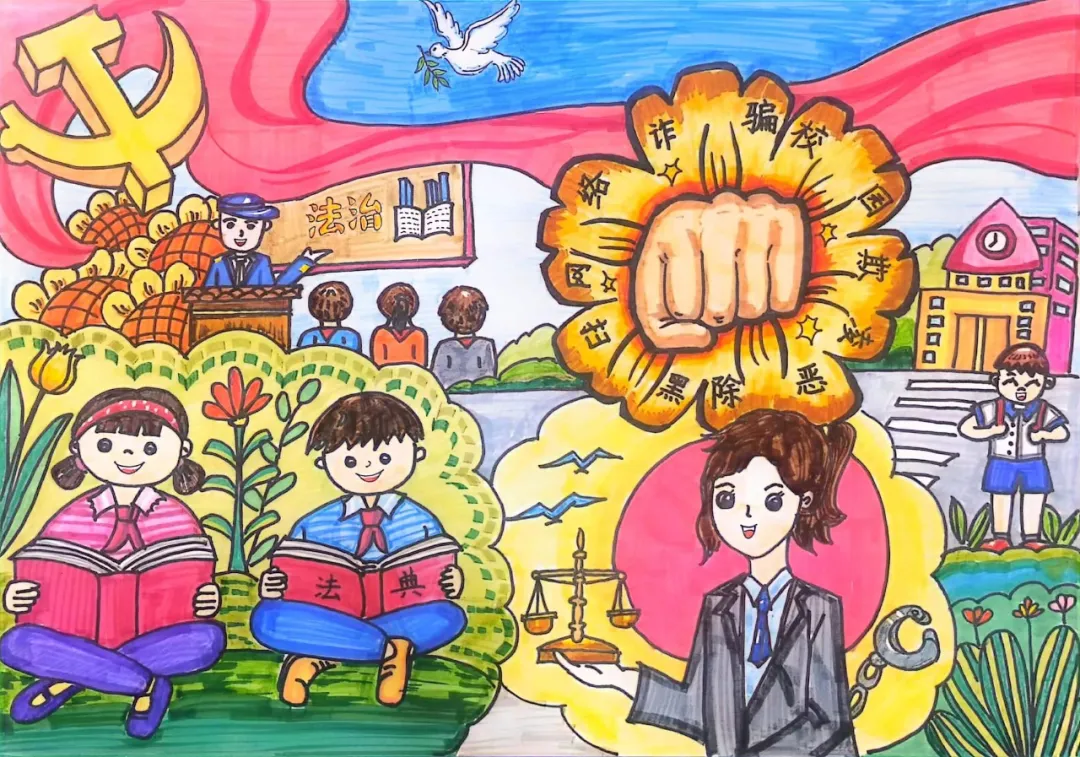 这幅画以拳头为中心,用力出击打碎各种违法犯罪。祖国的花朵在法治的社会健康成长,广泛开展宪法法治的宣传教育活动。