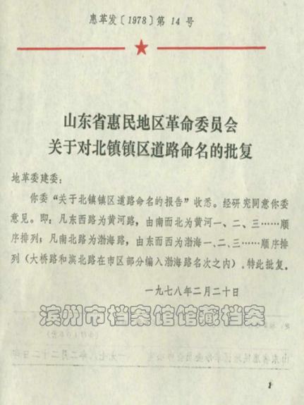据馆藏档案《滨县革命委员会关于建立北镇镇的请示报告》所述,北镇,原是滨县的一个农村集镇(集镇是指乡、民族乡人民政府所在地和经县级人民政府确认由集市发展而成的作为农村一定区域经济、文化和生活服务中心的非建制镇),归属同时期的北镇公社管理。1950年5月,渤海区撤销,中共惠民地方委员会成立。1952年10月,惠民地区党、政、军直属机关迁署该镇后,北镇成为惠民地区政治、经济、文化中心。随着经济社会发展,加上油田开发建设的推动,该区域城建规模发展迅速,区域内道路数量日渐增多,至1976年左右,南北向和东西向道路有20多条,但一直没有对道路进行官方命名,有些道路由群众自发命名使用,名称五花八门,对交通、规划、邮政、房管等城建管理工作造成了一定程度的混乱。为了解决这个问题,1976年6月22日惠民地区革命委员会城市建设局向地区建委提交了公路命名报告。1978年1月16日,地区建委向地区革命委员会提交了《关于同意北镇市区公路命名报告的请示报告》,2月20日,惠民地区革命委员会对北镇镇区道路命名进行了批复。