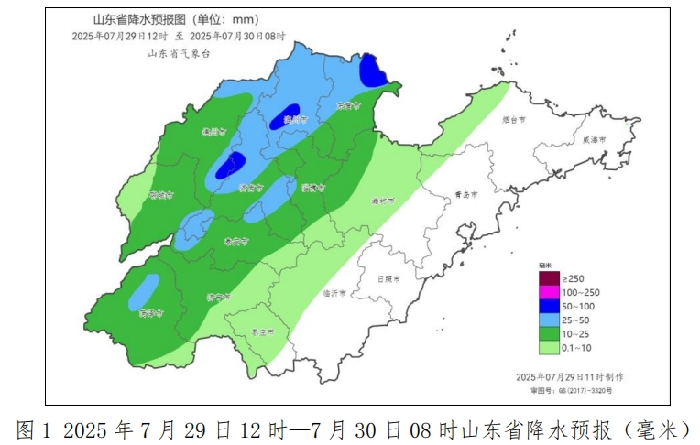 山东省气象台于7月29日11时15分发布强对流黄色预警:受高空槽和副热带高压边缘暖湿气流影响,预计29日中午至夜间,菏泽、济宁、聊城、德州、滨州、东营、济南、泰安、淄博、潍坊及渤海、渤海海峡将出现强对流天气,上述地(海)区有中到大雨局部暴雨或大暴雨,并伴有7~9级局部10级以上雷雨大风和小时降水量40~70毫米的短时强降水;另外,枣庄、临沂和烟台西部局部有雷雨或阵雨(图1)。全省平均降水量5~15毫米。此次强对流天气过程对户外旅游、交通运输、农业生产和室外作业等有不利影响,请加强防范。