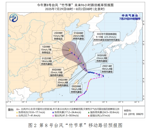山东省气象台于7月29日11时15分发布台风“竹节草”预报和海上大风黄色预警:今年第8号台风“竹节草”的中心29日10时位于浙江省舟山市东南方向约385公里的东海南部海面,中心附近最大风力8级(18米/秒),中心最低气压为992百帕。预计,“竹节草”将以每小时10—15公里的速度向西北方向移动,强度逐渐增强;将于30日白天在浙江三门到江苏启东一带沿海登陆(23~25米/秒,9~10级,热带风暴级或强热带风暴级),登陆后继续北上,强度缓慢减弱(图2),8月1—2日在江苏中北部及其近海一带徘徊。另外“竹节草”也有可能在浙江北部近海北上。