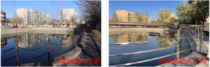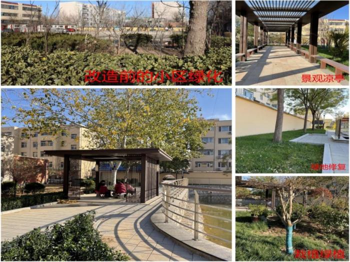 改造工程将“生态优先”理念贯穿始终,把“海绵城市”建设要求深度融入社区更新,实现“环境美”与“功能实”的有机统一。一方面,注重增绿添景扩空间。整理、修复、新增绿地15处,共计8000平方米,栽种苗木800余棵;充分利用边角地、废弃地“见缝插绿”,将一处废弃仓库后院改造为配备灌木、塑胶步道的休闲空间,变“遗忘角落”为“幽静花园”。另一方面,强化生态修复提效能。对社区排水系统进行了改进和修缮,采用透水材料铺装,改善排水积水问题。停车位使用透水植草砖,内置生物滞留带,既净化雨水又吸收尾气;重点修复废弃池塘,加装护栏,增建200平方米景亭、廊架,使其兼具景观观赏、汛期排涝、生态保湿等多重功能。