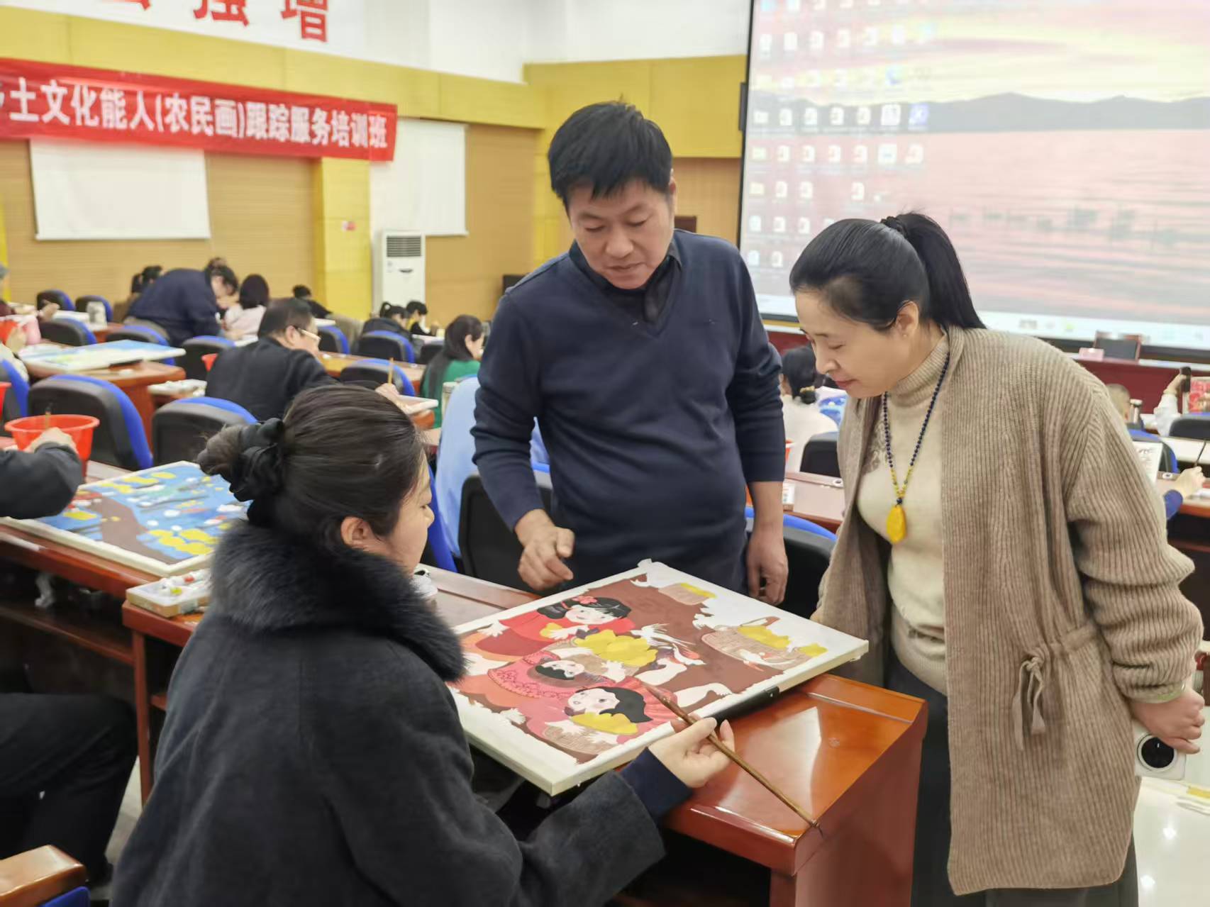 此次培训是全国首届“大地流彩·信美乡村”村画文化交流活动的重要组成部分,精准对接农民画创作群体的实际需求,采用“专业授课+实操指导+交流观摩”的教学模式,让学员们在学、看、练中夯实创作基础。课堂上,专业导师围绕农民画题材挖掘、构图技巧、色彩运用等核心内容细致讲解,结合学员们的原创作品进行一对一精准点评,手把手指导修改思路,针对创作中遇到的题材单一、技法生硬等问题现场答疑解惑,帮助学员破解创作瓶颈,精进绘画技艺。