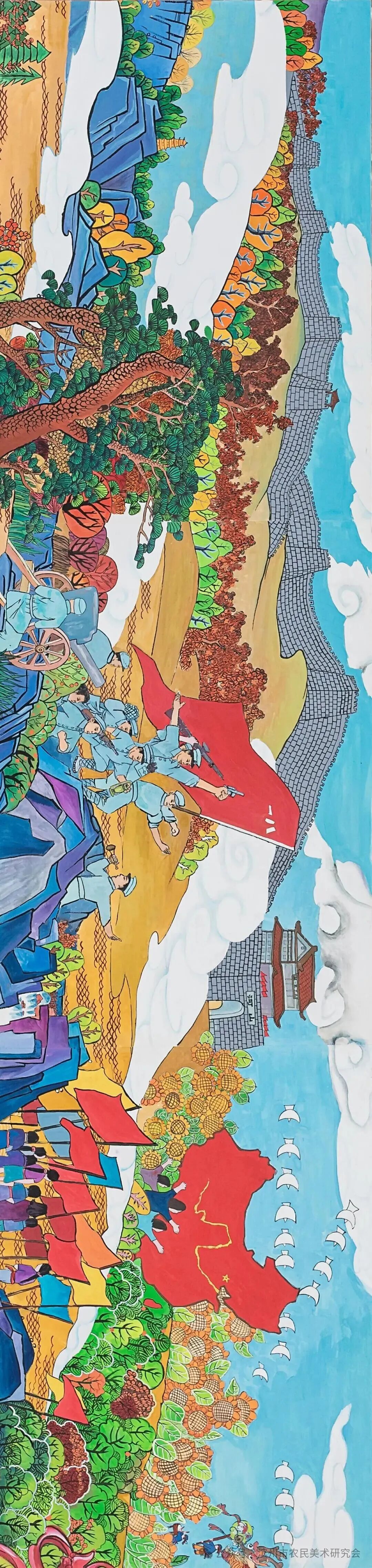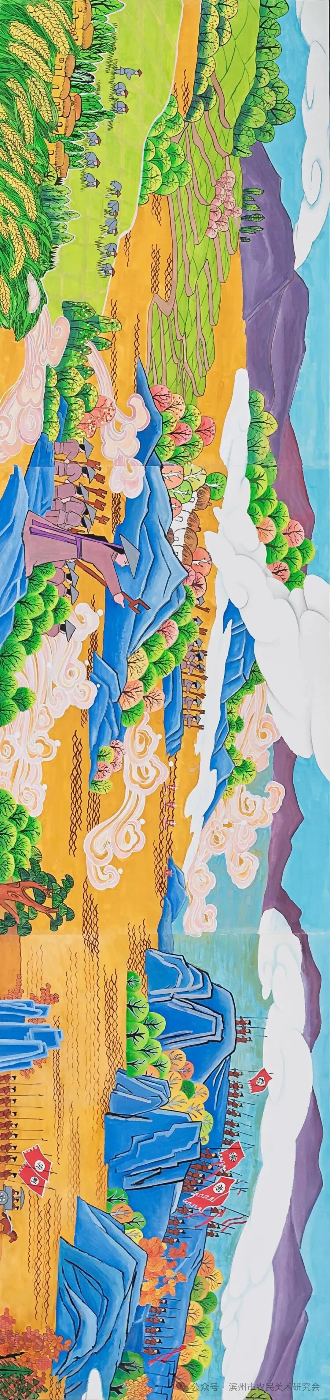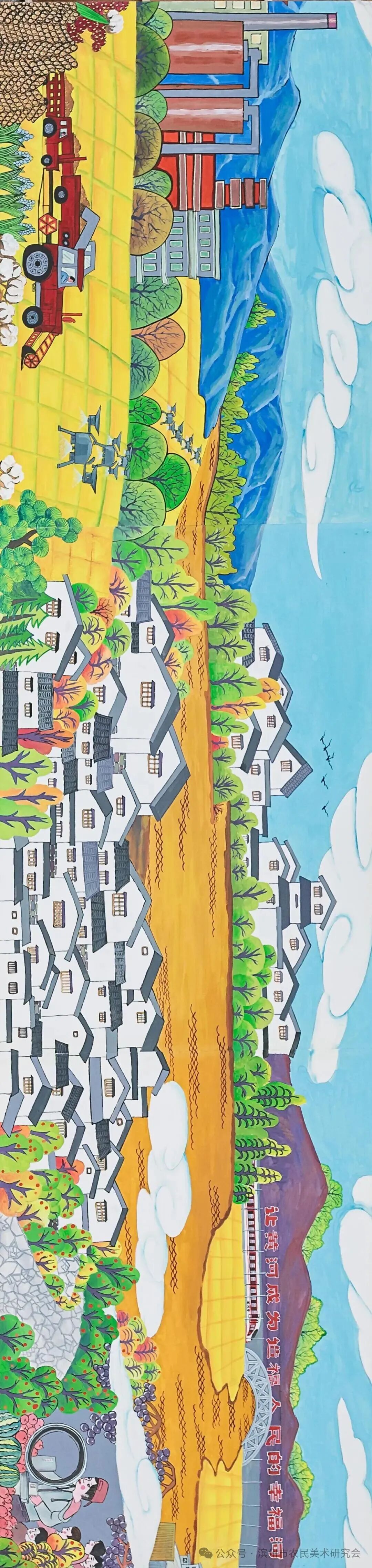 长卷题材创作立足于黄河的过去、现在、未来的历史主线,结合黄河的传说、远古农业、历史演变、民族兴盛、建立新中国、现代工农业、新时代村貌、民乐安居、梦想与未来的历史纵向发展,通过系列画面构建黄河“苦难-新生-梦想”的叙事脉络,融合“饱满构图、浓烈色彩、时空折叠”等传统技法,以黄河、白云、山脉为横向轴线串插整个画面,有机组合而成,既展现黄河的农耕文明底蕴,又呼应生态保护与科技共生的未来愿景,用农民画的艺术创作形式表现黄河文化的独特优势和魅力,使这幅长卷成为镌刻黄河农耕文明的鲜活史诗。