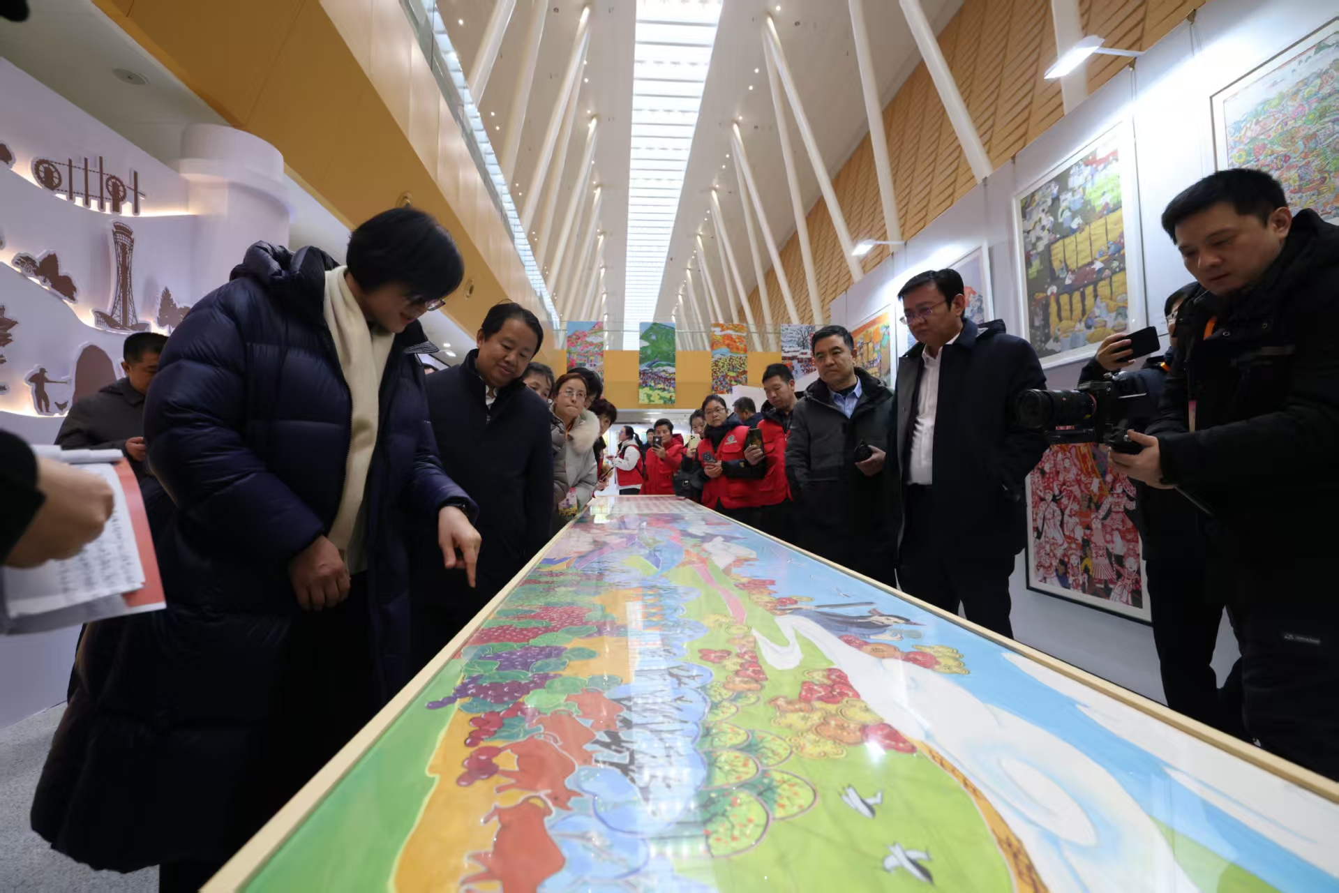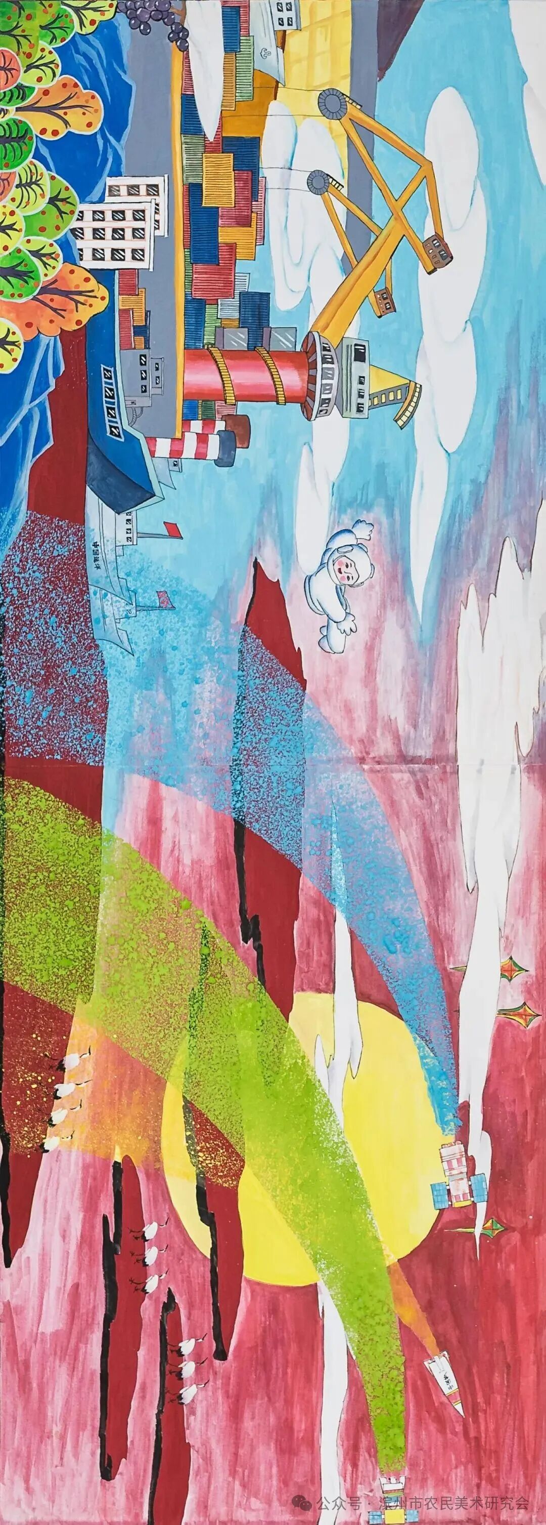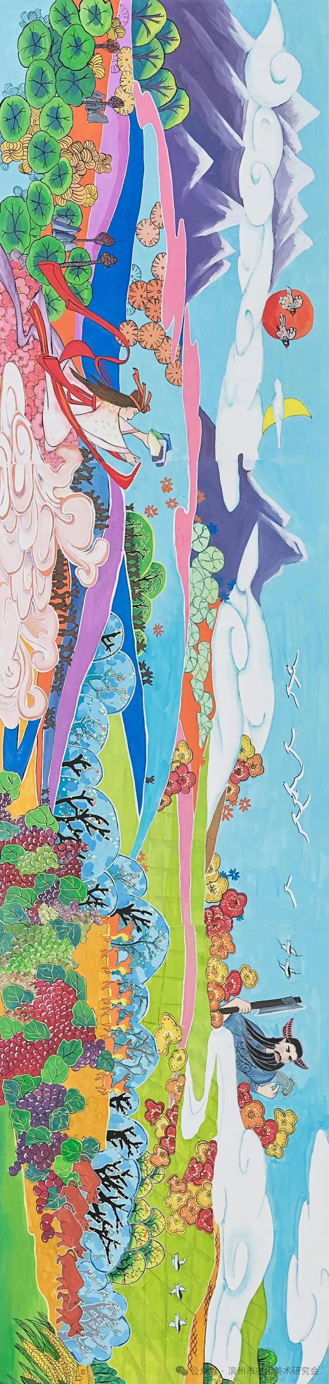 长卷题材创作立足于黄河的过去、现在、未来的历史主线,结合黄河的传说、远古农业、历史演变、民族兴盛、建立新中国、现代工农业、新时代村貌、民乐安居、梦想与未来的历史纵向发展,通过系列画面构建黄河“苦难-新生-梦想”的叙事脉络,融合“饱满构图、浓烈色彩、时空折叠”等传统技法,以黄河、白云、山脉为横向轴线串插整个画面,有机组合而成,既展现黄河的农耕文明底蕴,又呼应生态保护与科技共生的未来愿景,用农民画的艺术创作形式表现黄河文化的独特优势和魅力,使这幅长卷成为镌刻黄河农耕文明的鲜活史诗。