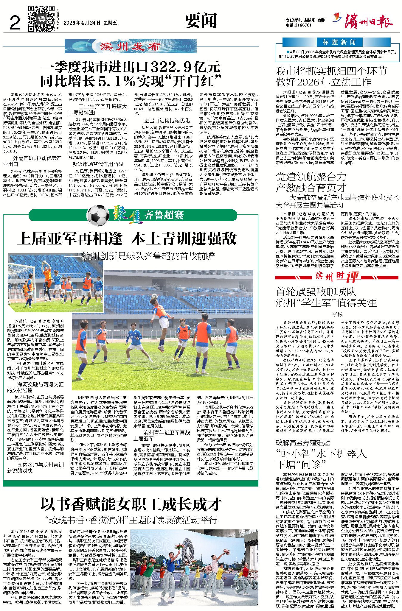 滨州日报/滨州网讯 4月23日,记者在2026年第一季度滨州市外贸进出口情况新闻发布会上获悉,今年一季度,我市开放型经济进中向好,外贸市场主体活力持续释放,进出口结构持续优化,有力为全省外贸“走在前、挑大梁”贡献滨州力量。据滨州海关统计,2026年一季度,我市进出口322.9亿元,同比增长5.1%,高于全省0.4个百分点。其中,出口139.9亿元,增长2.8%;进口183亿元,增长6.8%。总体来看,有以下特点:
