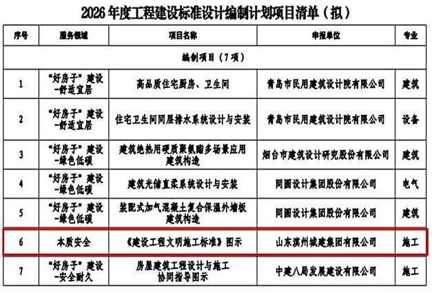 滨州日报/滨州网讯 近日,山东省住房和城乡建设厅印发《关于公布2026年度山东省工程建设标准设计编制计划(第一批)的通知》,由山东滨州城建集团有限公司主编的《〈建设工程文明施工标准〉图示》成功获批立项。这是我市本地企业首次承担主编的省工程建设标准设计,标志着滨州在工程建设标准化、规范化领域取得突破性进展。