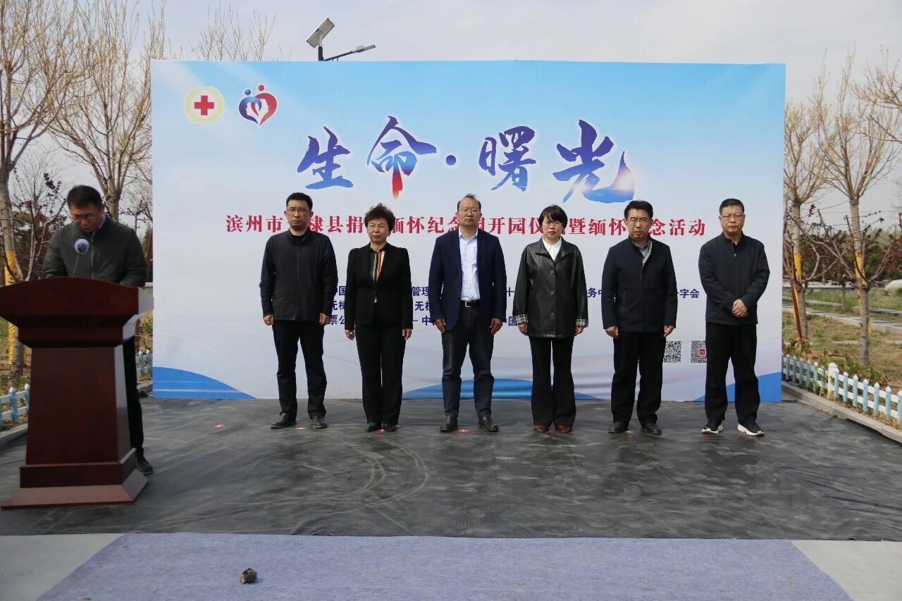 在无棣县生命纪念园院内,举办了无棣县捐献缅怀纪念园开园仪式暨“生命·曙光”遗体和人体器官捐献缅怀纪念活动,市红十字会党组书记、常务副会长尹常智为活动致辞,市红十字会党组书记、常务副会长尹常智,市红十字会党组成员、副会长王春平,无棣县副县长、县红十字会会长王立娟,无棣县红十字会党组书记、常务副会长张建共同为无棣县捐献缅怀纪念园揭幕。