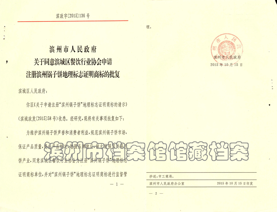 本次公布的档案史料来源于滨州市档案馆馆藏滨州市人民政府办公室全宗,文件制发机关为滨州市人民政府办公室,文件形成时间为2015年10月15日,题名为《滨州市人民政府关于同意滨城区餐饮行业协会申请注册滨州锅子饼地理标志证明商标的批复》。文件内容是滨州市人民政府批复同意滨城区餐饮行业协会申请注册滨州锅子饼地理标志证明商标。
