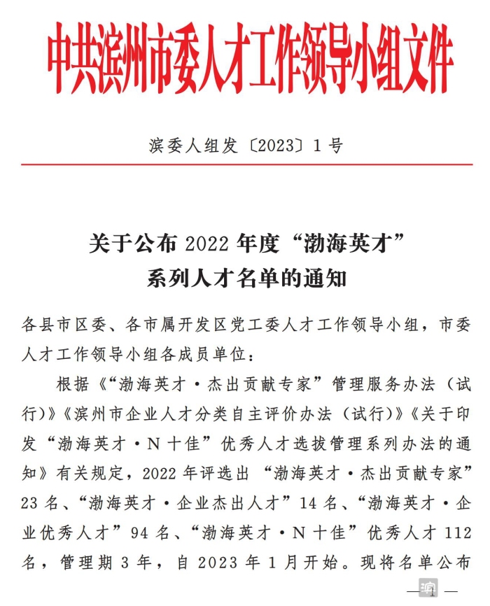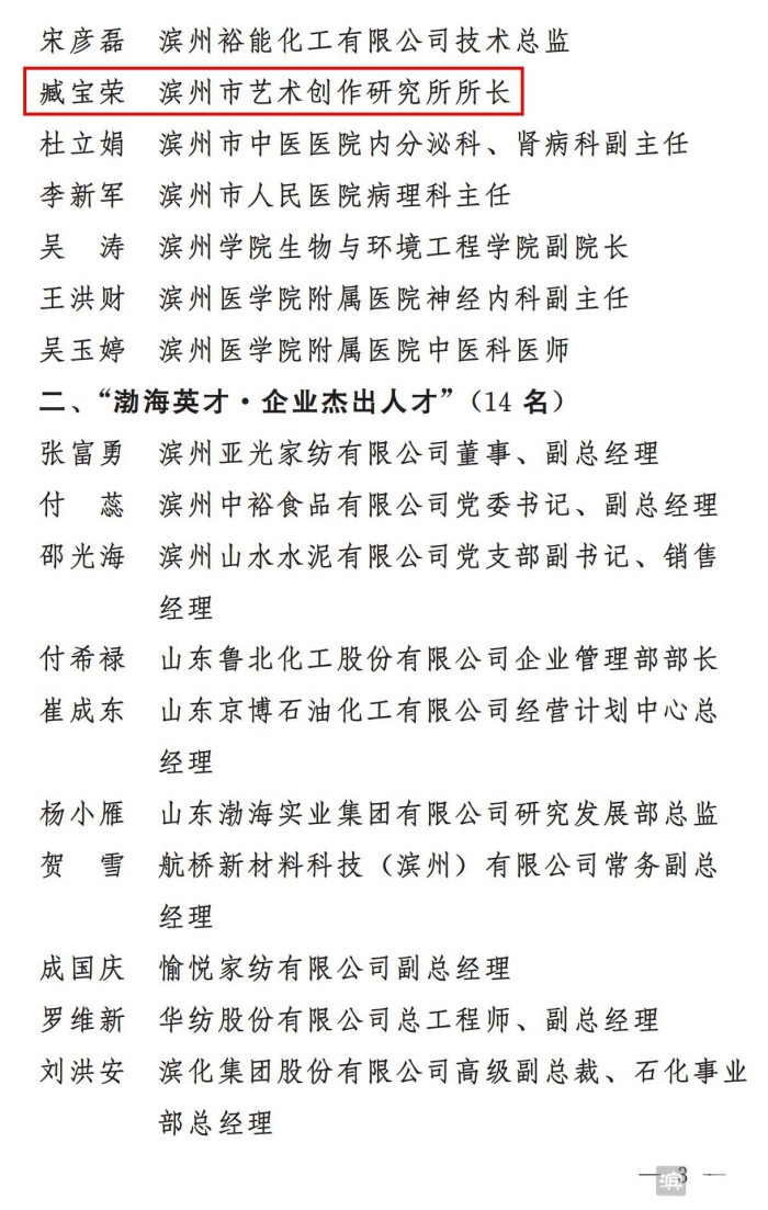 滨州日报/滨州网讯 近日,市委人才工作领导小组发布了《关于公布2022年度“渤海英才”系列人才名单的通知》,市艺研所所长臧宝荣获“渤海英才·杰出贡献专家”荣誉称号,全市共23位专家获得该项荣誉,臧宝荣是全市文化艺术领域唯一获得者。