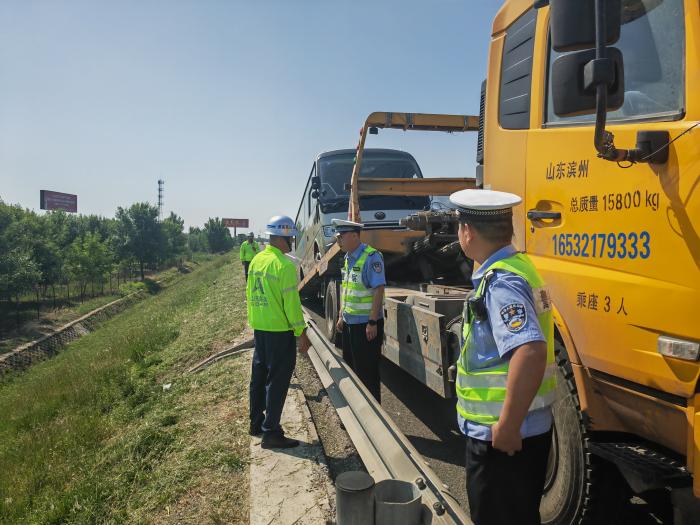 滨州日报/滨州网无棣讯 5月28日上午,一辆中巴车在G18荣乌高速587公里处突然爆胎,车上载有14名乘客,事故发生后,乘客立即报警请求救援。山东高速滨州发展有限公司无棣收费站、高速交警三中队及路管中心迅速响应,立即展开救援工作。