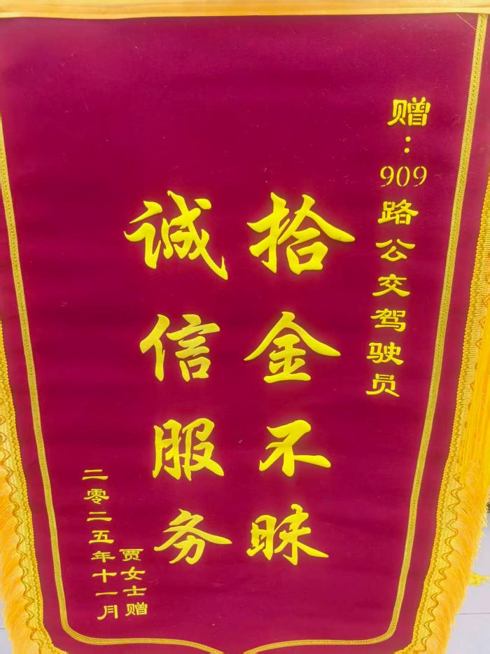 11月2日,909路驾驶员张金传在终点站清扫车厢时,发现了一部手机。张金传立即将手机交由公司管理人员保管。失主发现手机丢失后万分焦急,得知被妥善保管才放心。11月7日,失主贾女士特意送来写有“拾金不昧 诚信服务”。