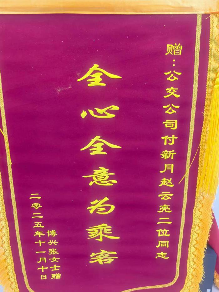 11月6日下午,乘客张女士赶到北海调度室,寻找丢失在990路公交车上的手提包。调度员付新月立即逐车排查,因乘客需在当日下午返回博兴,便留下电话先行离开,约定找到后再来领取。张女士离开不久,990路驾驶员赵云亮驾驶的车辆驶入车场,付新月发现赵云亮已妥善保管好手提包,当即联系该乘客。张先女士立即来到公交调度室,看到失而复得的手提包激动不已。事后,张女士专程从博兴赶回北海,为公交人付新月、赵云亮送来“全心全意为乘客”的感谢锦旗表达谢意。