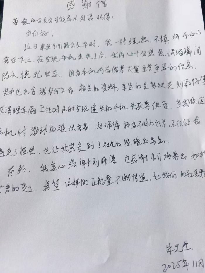 在北海公交公司北海站,9091路驾驶员刘磊用拾金不昧的善举,为公交驾驶员增添了一抹亮色。11月10日,乘客朱先生乘坐9091路公交时,不慎将手机遗落车厢。驾驶员刘磊在清理车厢卫生时发现了手机,并妥善保管。失主朱先生取回手机后,激动不已,立即写下感谢信,对刘磊师傅的拾金不昧行为表示高度赞扬。