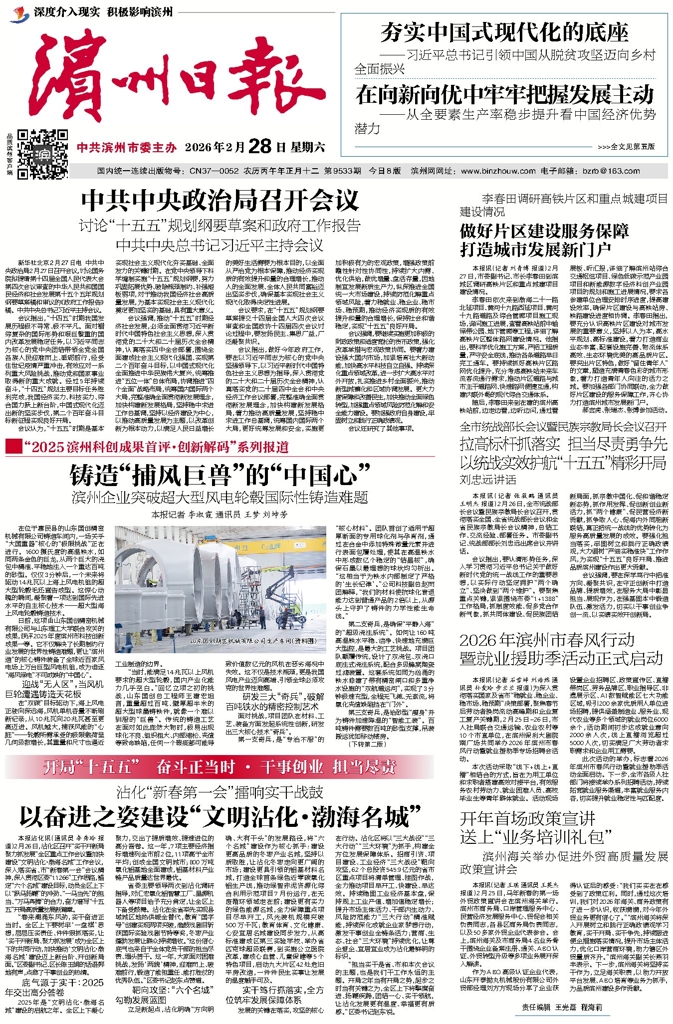 滨州日报/滨州网沾化讯 2月26日,沾化区召开“实干开新局聚力抓发展”全区重点工作会议暨加快建设“文明沾化·渤海名城”工作会议,深入落实省、市“新春第一会”会议精神,深入贯彻区委“11266”工作思路,锚定“六个名城”建设目标,动员全区上下以“跃马扬鞭”的冲劲、“一马当先”的担当、“万马奔腾”的合力,奋力谱写“十五五”开局高质量发展新篇章。